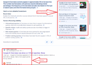 You can see AI overviews for many search queries now. These overviews are generally displayed for conversation queries, question-based queries, and long-tail queries that are very specific. However, the number of search queries showing AI overviews has increased to a great extent in recent months. Now, 13% of all search queries show AI overviews. The percentage may vary depending on the category, type of search query, and other factors.